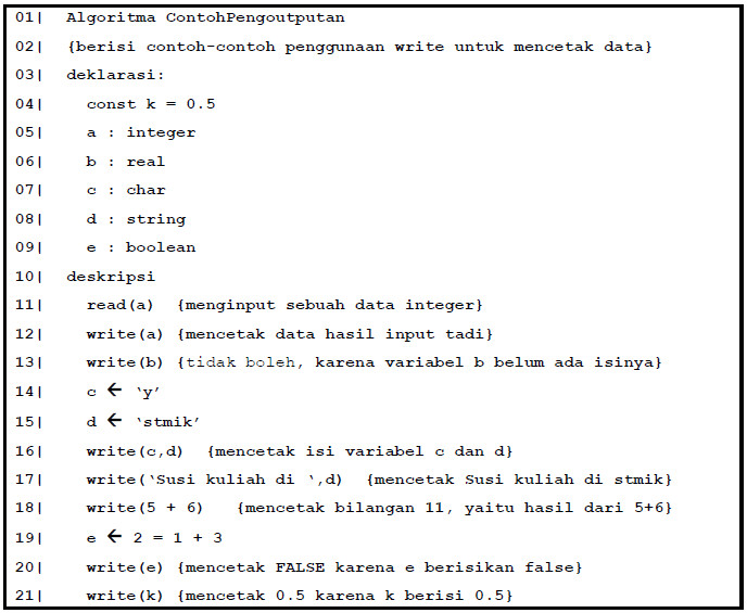 Algoritma dalam buku ini menggunakan kata kunci write untuk mencetak suatu data. Bentuk penulisannya adalah